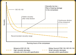 When it comes to polarity, the principle of “likeness ” applies. Polar gases such as ammonia are easily dissolved in polar oils such as polyglycol, while non-polar gases such as hydrocarbons are less easily dissolved in polar oils. Taking these criteria into account, the tendency of a gas to be dissolved in lubricating oil can be calculated before the rotary screw compressor is filled with lubricant. This provides valuable information about oil viscosity under actual operating conditions and helps ensure that the lubricant meets the manufacturer ’ s viscosity requirements in real-life situations.